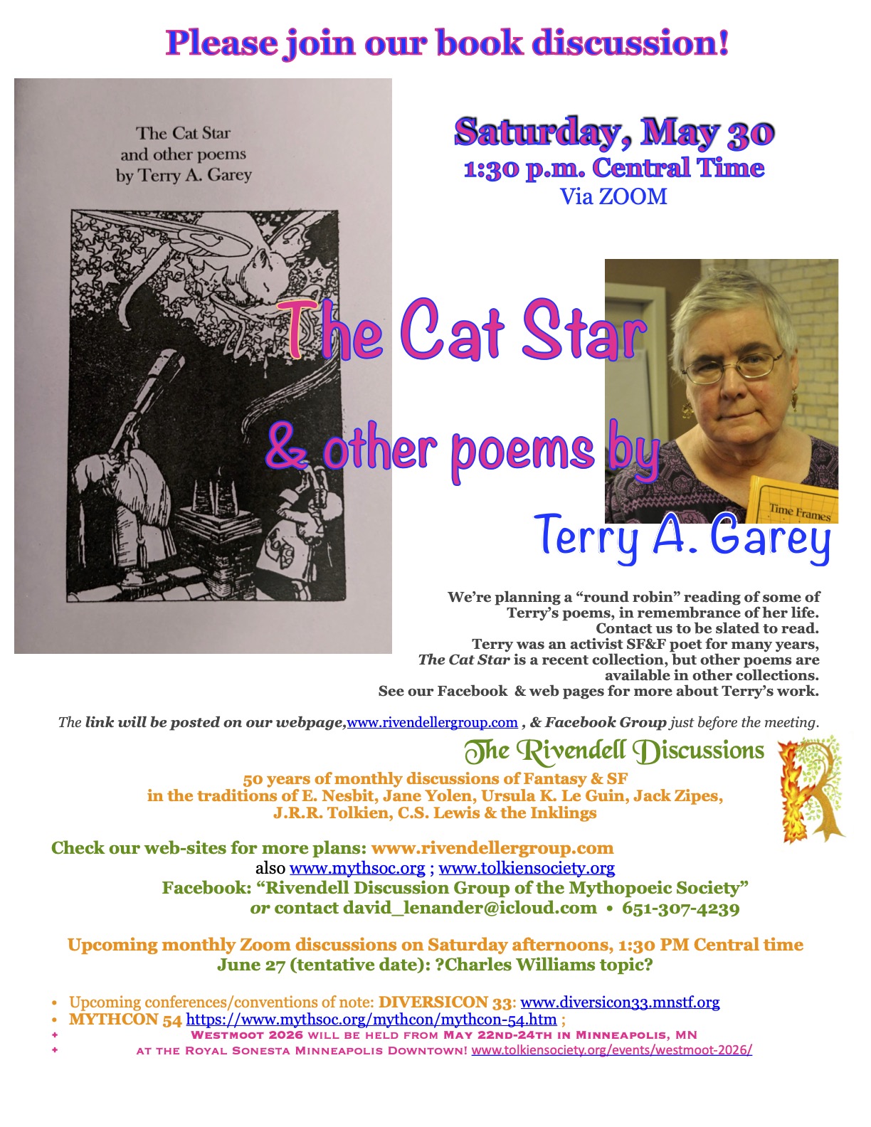Besides our monthly discussions, we have occasionally sponsored other programs, such as readings of new, original tales by such local writers (and members) as P.C. Hodgell and Eleanor Arnason, or lectures by professors like Stephen Prickett (U of Sussex, England, author of Victorian Fantasy), or U of MN students like Mike Levy, or SF & Fantasy novelists like C.J. Cherryh, Ben Bova, Gordon Dickson and Phyllis Ann Karr. We have also participated in the Mpls. S.F. Convention (“Minicon“), held annually during Easter weekend, the Fourth Street Fantasy Convention, SF Minnesota’s Diversicon, Arcana, and acted as organizing committee for the 24th annual Conference of the Mythopoeic Society in 1993, and other activities. With some of these other organizations, and especially with our “offspring,” the local C.S. Lewis Society and Second Foundation, a group that regularly meets to discuss SF, we have often held joint meetings, worked together on publicity or cross-listed our events in newsletters, etc.