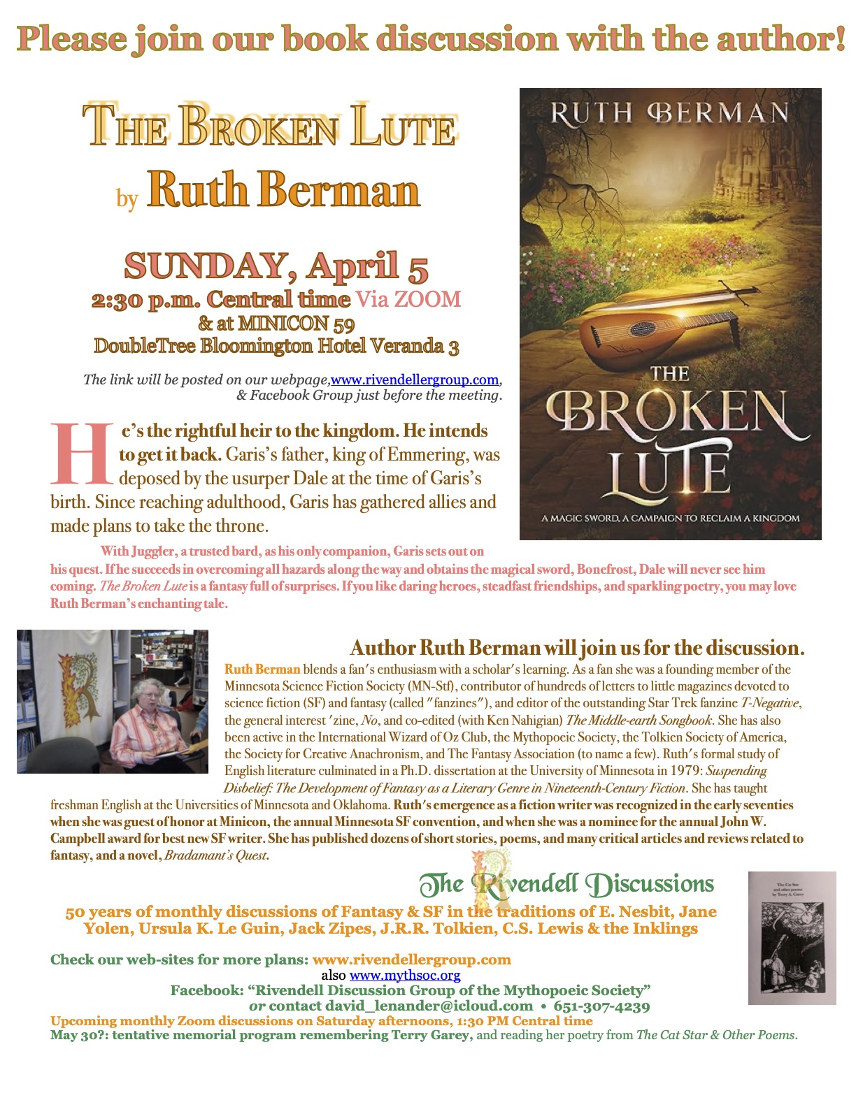 We’re particularly proud of the creative and scholarly productions of some of our members, and especially of our annual December “Readings from Rivendell” program, where our members have read many stories and poems that were much enjoyed by all listeners–and in many cases, by later readers when these were published.